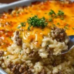 A comforting and budget-friendly casserole packed with ground beef, rice, and melted cheese, perfect for busy weeknights or potlucks.