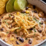 A creamy, flavorful chili made with shredded chicken, black beans, and corn, simmered to perfection in a slow cooker.