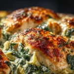 A comforting and flavorful dish combining tender chicken breasts with a creamy spinach and artichoke mixture.