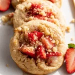 A delightful fusion of classic strawberry shortcake and cookies, featuring fresh strawberries in a soft, buttery dough topped with a shortcake crumble.